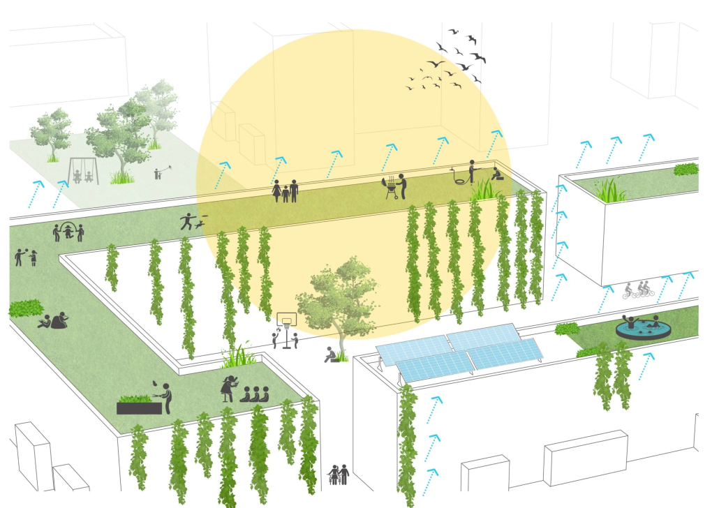 Fassadenbegrünungen verbessern das Mikroklima, kühlen durch Verdunstung, binden Staub und reduzieren die Aufheizung sonnenexponierter Fassaden. Sie tragen zur Innenraumkühlung bei, indem Rankpflanzen natürliche Verschattung bieten. Zudem fördern sie die Artenvielfalt, etwa durch bienenfreundliche Kletterpflanzen, und mindern indirekt Lärmreflexionen an stark befahrenen Verkehrswegen.