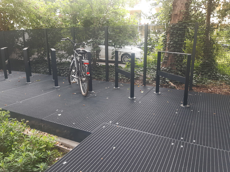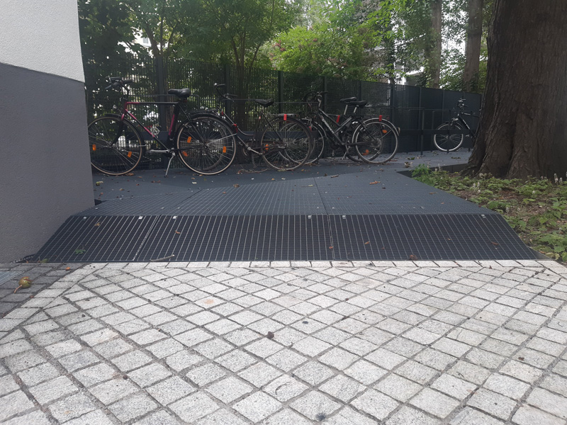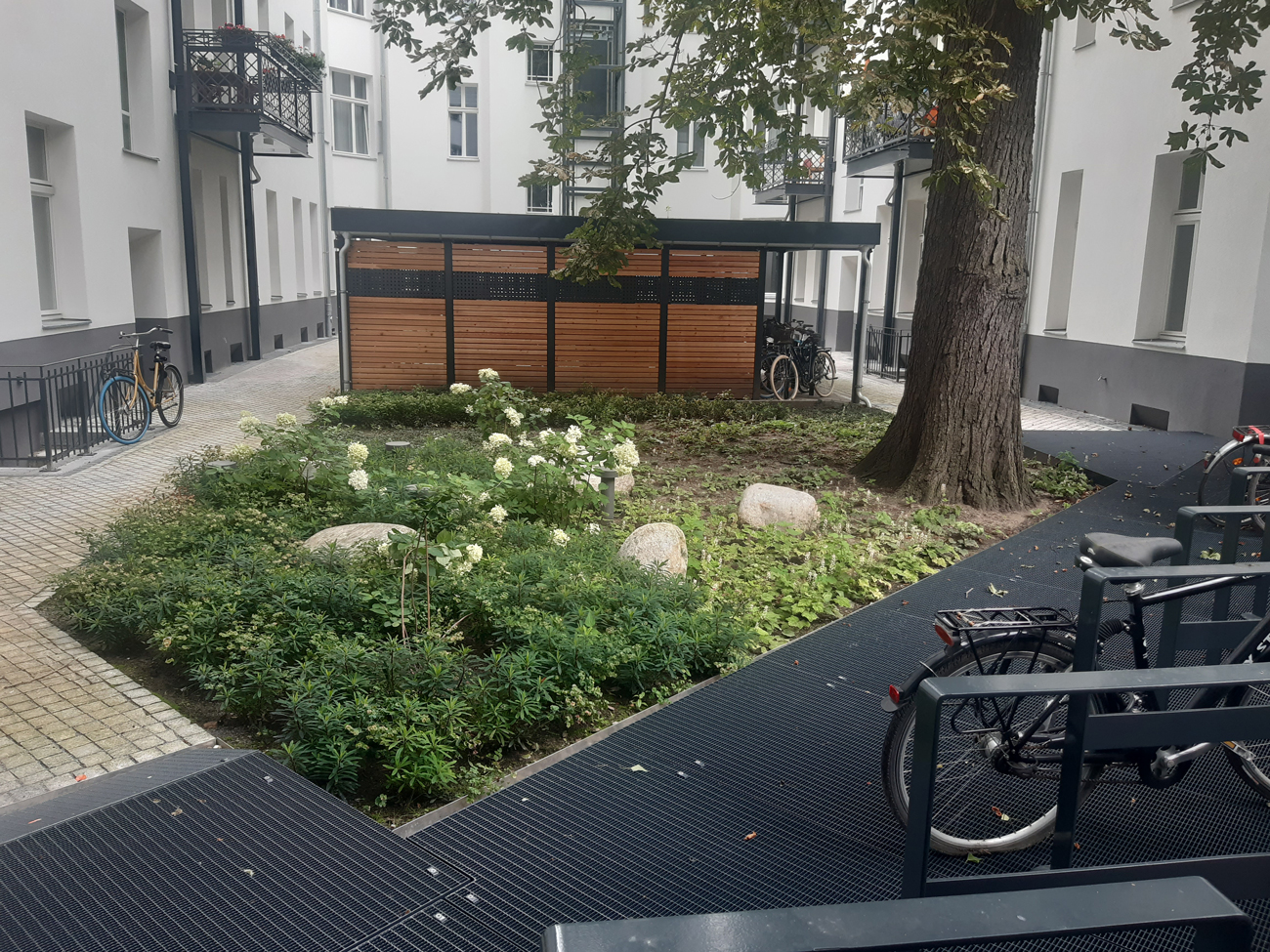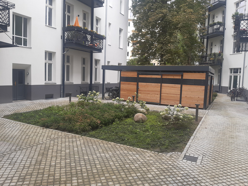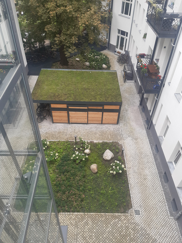 | Merkmale: | • Anlage einer zentralen Müllcontainer-/Fahrrad-/Kinderwageneinhausung mit extensiver Dachbegrünung • Großflächige Wurzelbrücke mit integrierten Fahrradhaltern • Neugestaltung der Wege- und Vegetationsflächen • Regenwasserversickerung über Rigole |