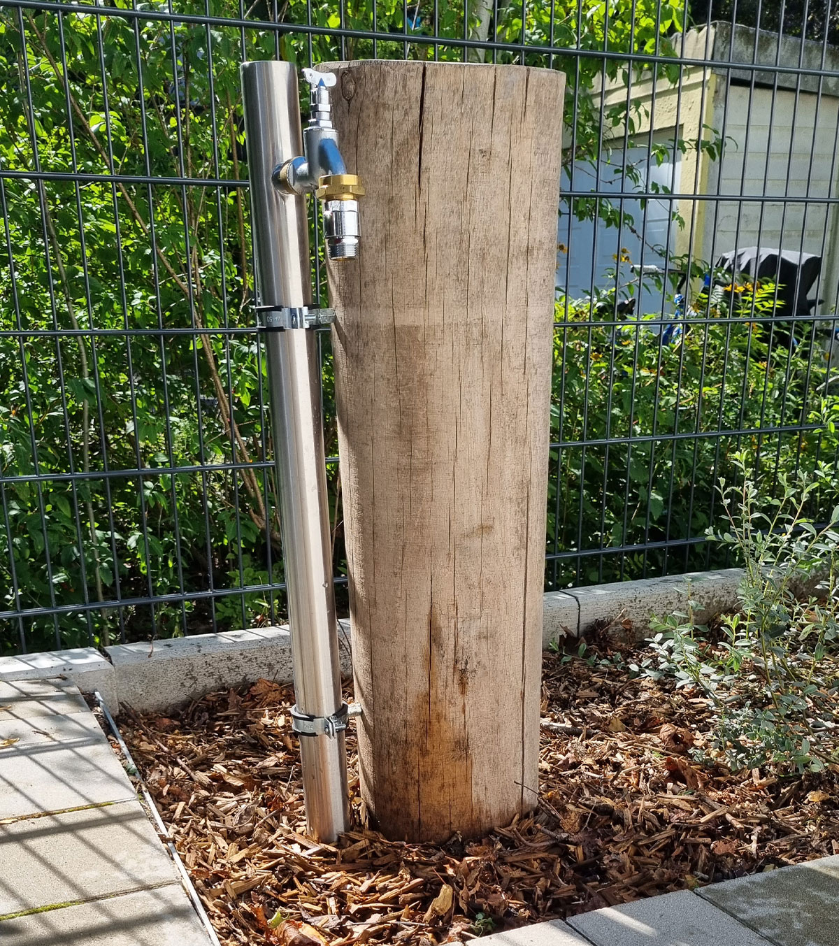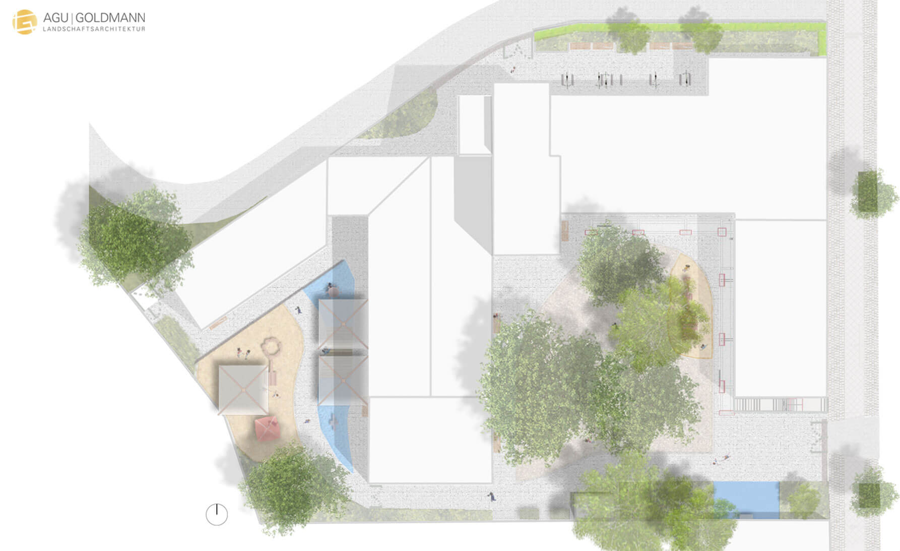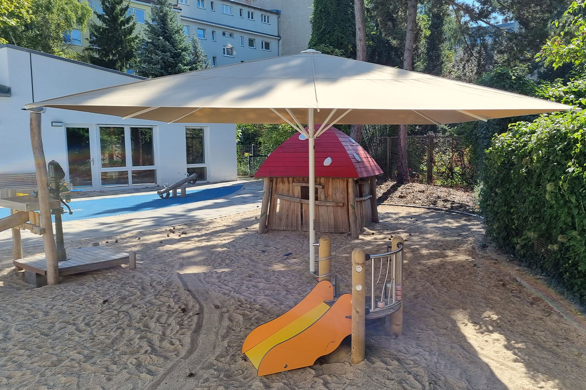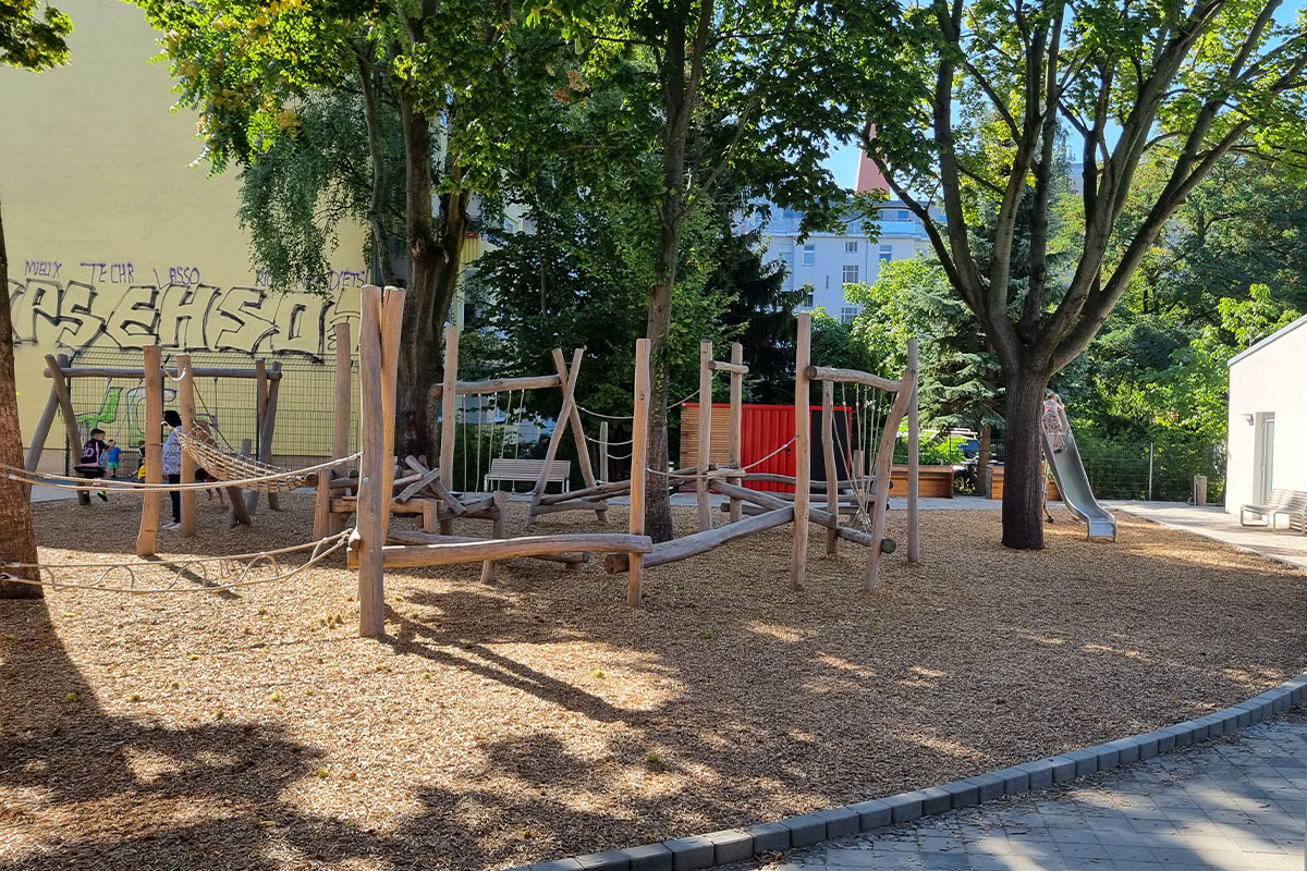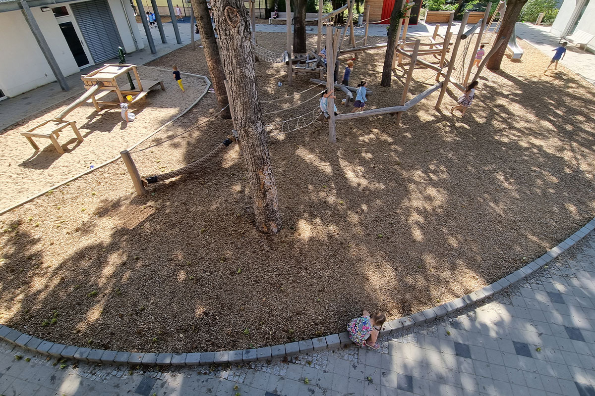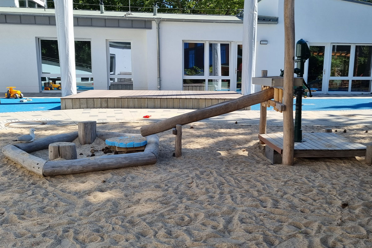| Merkmale: | • Spielbereiche für 0 – 3 jährige (Krippe) und 3 – 6 jährige Kinder • Einbeziehung von Bestandsbäumen im Spiel- und Kletterbereich • Fallschutz durch zertifizierten Holzhäcksel • Beide Spielbereiche mit Wasserpumpen, Matschbereichen und Wasserzapfstellen • Regenwasserversickerung der Dachflächen über Versickerungsboxen • Pflasterarbeiten im öffentlichen Gehwegbereich |