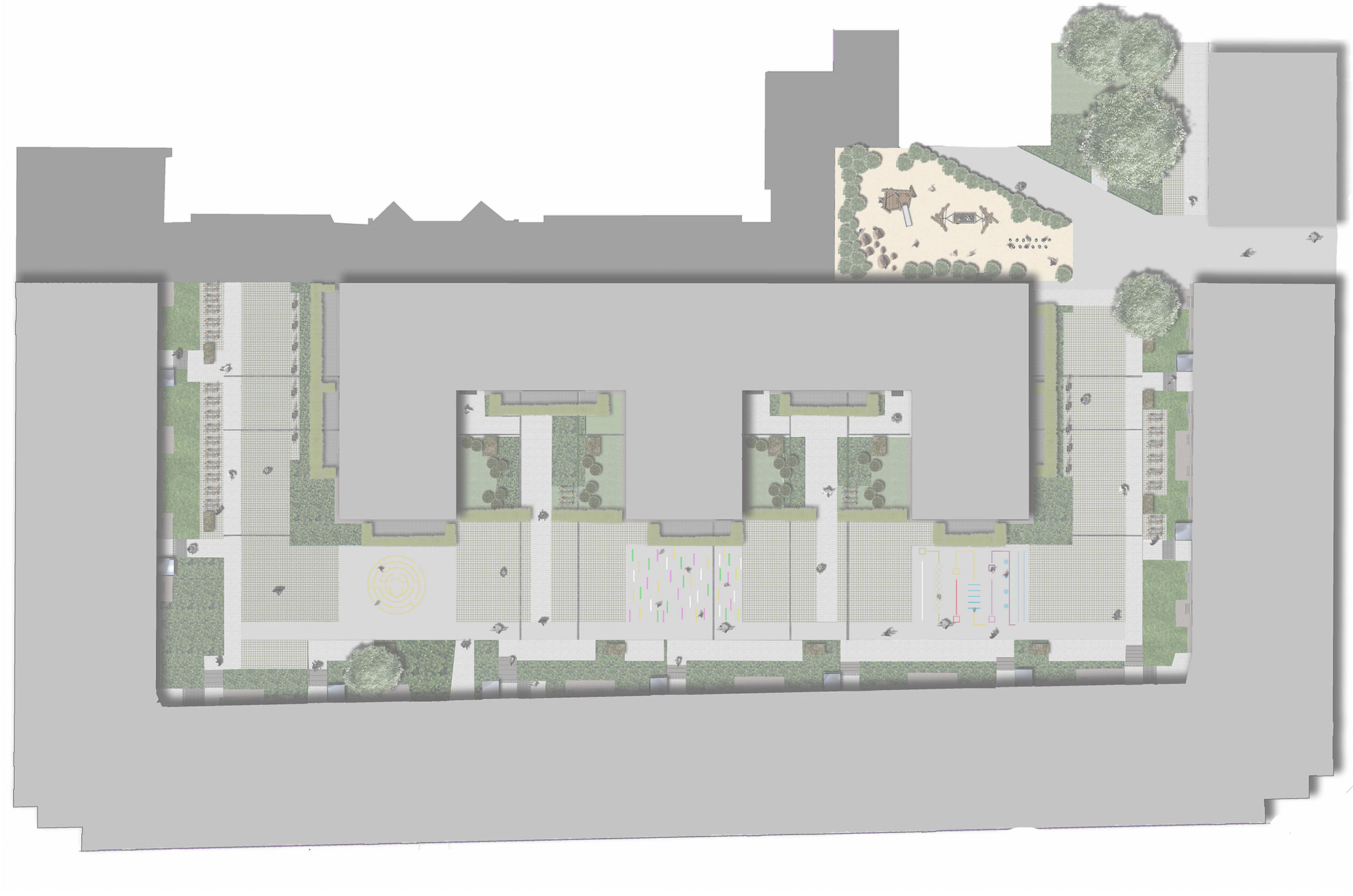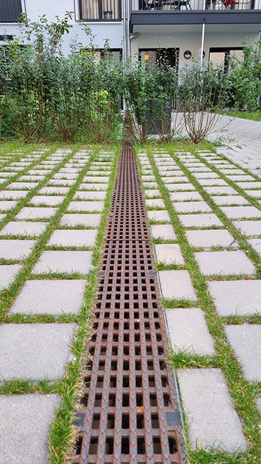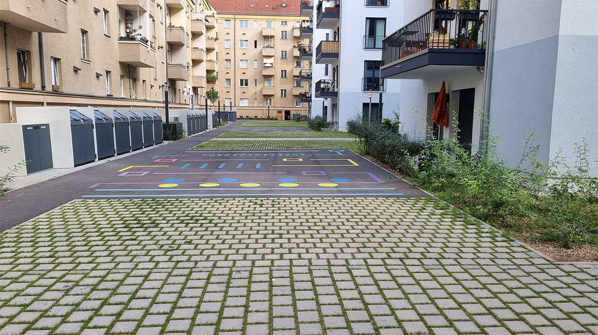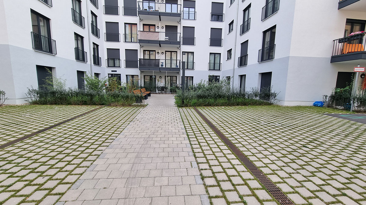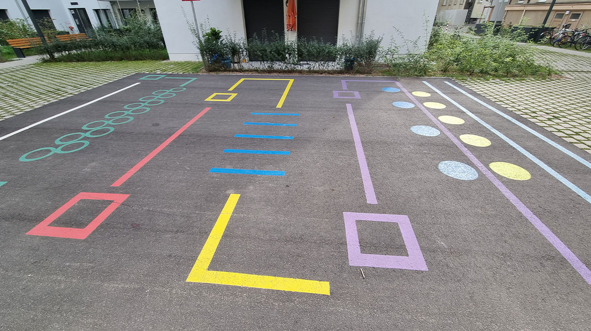 | Merkmale: | • Doppelnutzung („Multicodierung“) von Feuerwehraufstellfläche in Asphalt und Spielbereich für Bewegungsspiel • Intensive Dachbegrünung (unterbaute Fläche/Tiefgarage) • Regenwasserversickerung der Dachflächen, Wegeflächen und Tiefgaragendachfläche über • Versickerungsboxen |
