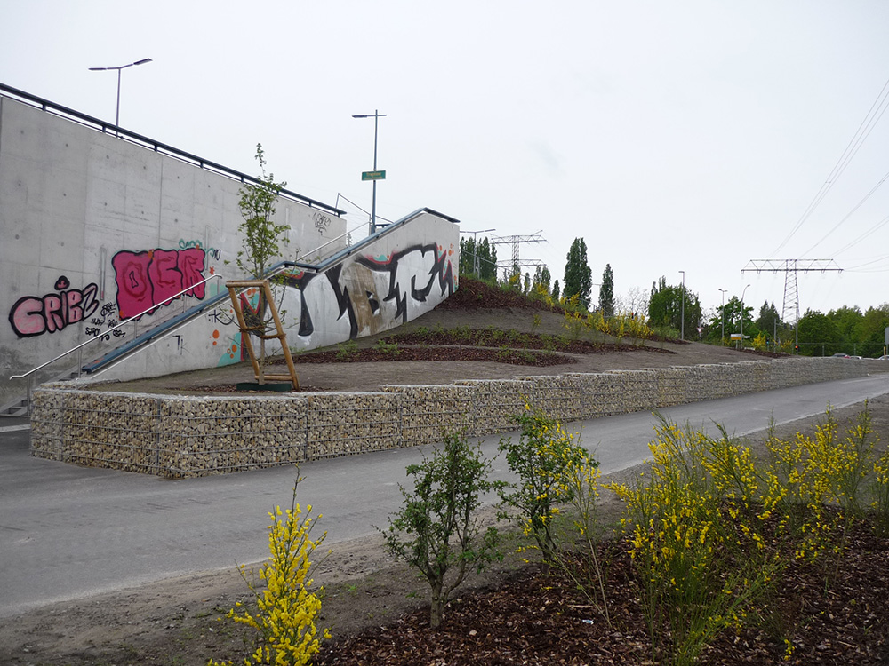 Insofern dient das Eidechsenhabitat an der SOV als vorgezogene Kompensationsmaßnahme für künftige Projekte. In der Grünanlage wurde ein Areal ausgewiesen, auf dem günstige Voraussetzungen für die Ansiedelung der Zauneidechsen geschaffen wurden. Die Fläche liegt sonnenexponiert und wurde mit unterschiedlichen Kleinstrukturen ausgestattet. Hier wechseln offene Pionier- und Halbtrockenrasenflächen mit offenen Kies- und Schotterflächen, in denen Baumstämme und Baumwurzeln eingelassen sind. Strauchgruppen bieten Rückzugsräume; der Untergrund ist für die Überwinterung geeignet.